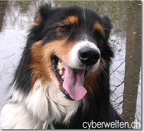 Hund das Maul geöffnet, als wenn er hecheln würde. Die Zunge hängt dabei aber